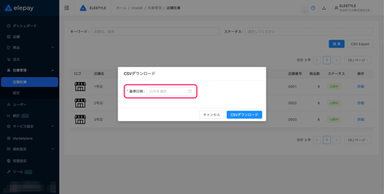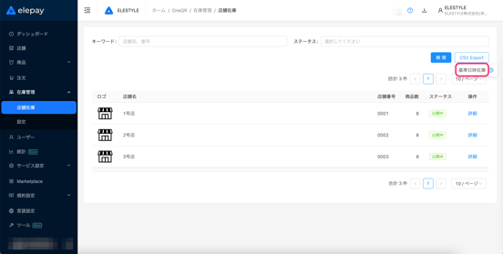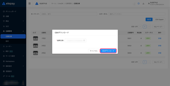 9.CSV Exportメニューから【基準日時在庫】をクリックします