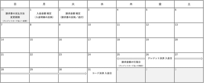| 月1回 | N月1日 〜 N月末日 | N+1月1日 | N+1月末日 (コード決済) |