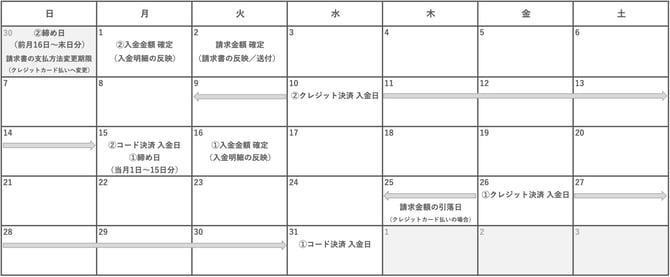 | ②N月16日 〜 N月末日 | N+1月1日 | N+1月15日 (コード決済) |